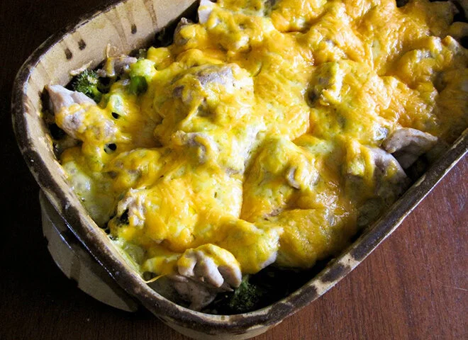 Cut the chicken into bite-sized pieces and sprinkle with pepper. Saute quickly in oil over medium heat just until opaque (don’t overcook – the chicken will get tough!). Wash asparagus or broccoli and Cook asparagus or broccoli until crunchy. Drain and arrange them in the bottom of a buttered casserole dish. Place the chicken on top. Mix together soup, mayonnaise, curry and lemon juice and pour over chicken. Sprinkle with cheddar cheese and bake, uncovered, at 350F (180C) for 30-35 minutes. Serves 6 people.